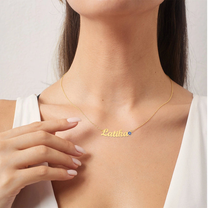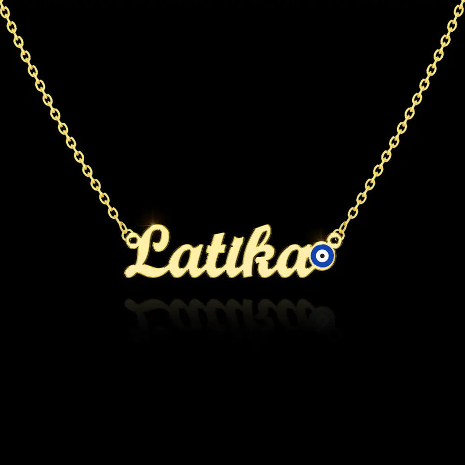 Protect your energy in style with our 24K Gold Plated Evil Eye Name Necklace, featuring vibrant enamel detailing and a personalized name design. A powerful symbol of protection, blended with elegance and individuality.